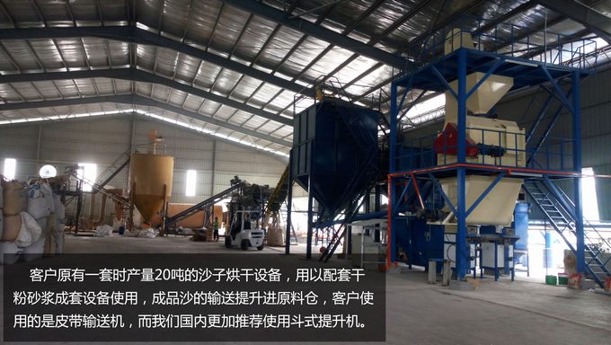 客戶原有一套時產(chǎn)量20噸的沙子烘干設(shè)備,用以配套干粉砂漿成套設(shè)備使用,成品沙的輸送提升進原料倉,客戶使用的是皮帶輸送機,而我們國內(nèi)更加推薦使用斗式提升機。